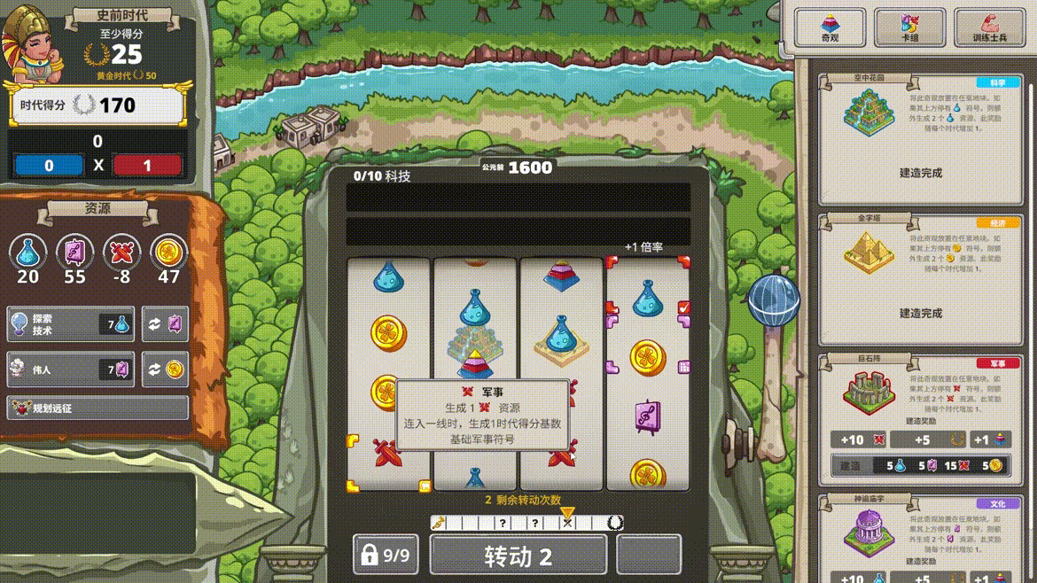 游戏最核心的乐趣,在于拉下拉杆后那充满期待的瞬间。老虎机上的符号将随机落下,带来资源、事件或挑战。你不仅会获得资源,更需要将相同的资源在机器中连成一线——不同的连线形状将转化为推动时代前进的积分。随着游戏进行,你可以将“万能符号”加入卡组,增加连线的可能性。每一次拉动,都是文明的一次心跳;每一次得分,都是帝国的一次跃进。你需要在“再摇一次”的冒险冲动与稳健积累的长期规划中,找到属于你的最佳节奏,最终积累足够积分,开创专属于你的辉煌时代。