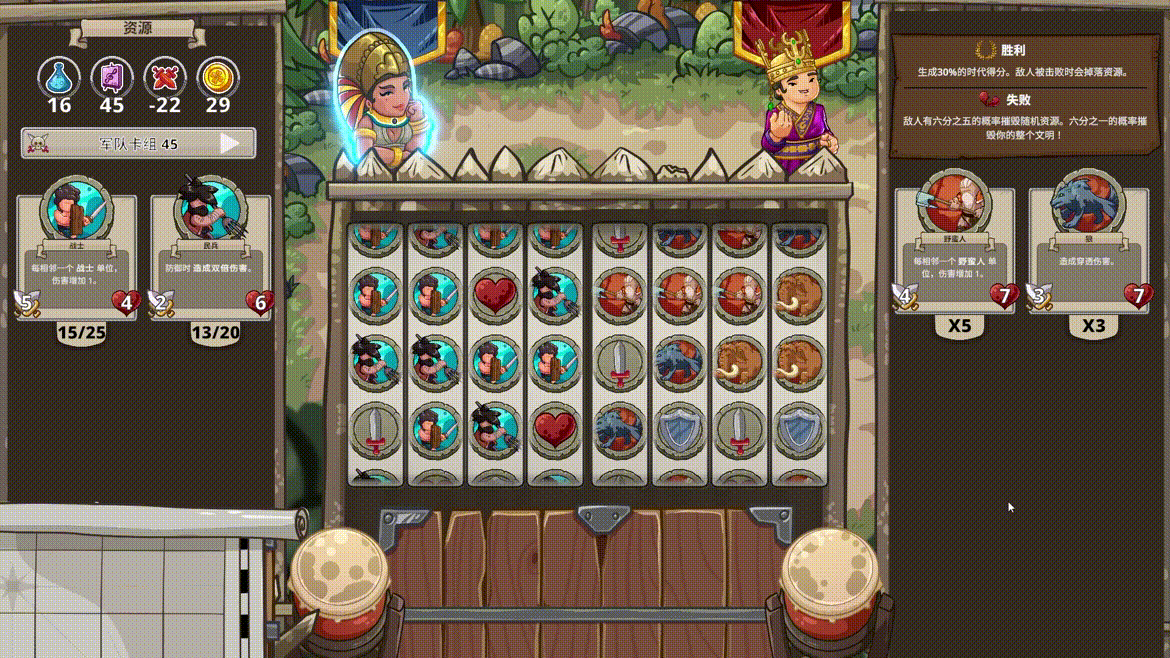 虽然核心玩法是充满随机乐趣的老虎机,但真正的策略深度体现在你的牌组构筑之中。通过获取更强大的资源卡牌来优化你的牌库,确保每一次拉杆都能产生更高收益。你可以利用资源推动科技发展,发掘历史上的伟大人物为己所用,也可以训练军队,抵御外敌或发起远征。游戏将资源管理、科技树和军事扩张巧妙地融入每一次“转动”中,让你在享受老虎机即时反馈的爽快感时,也能体验到运筹帷幄的深度策略。