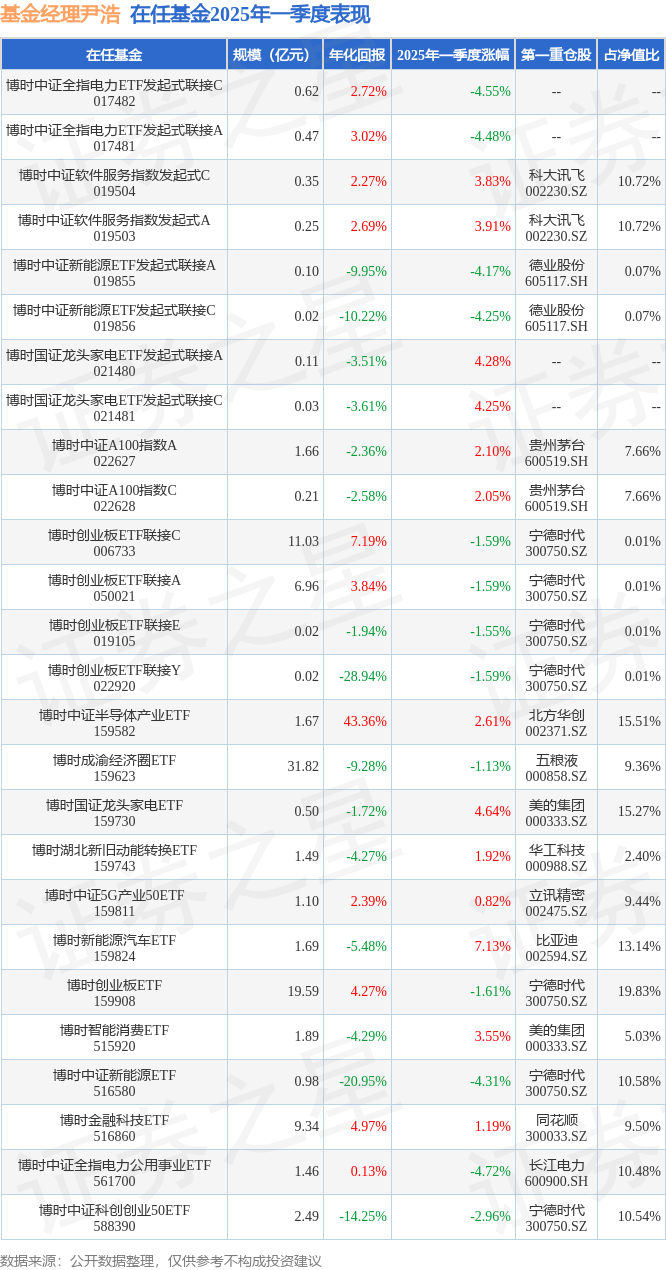 从基金规模来看,博时中证5G产业50ETF基金2025年一季度公布的基金规模为1.1亿元振兴配资,较上一期规模1.24亿元变化了-1406.95万元,环比变化了-11.34%。该基金最新一期资产配置为:股票占净值比98.32%,无债券类资产,现金占净值比1.76%。从基金持仓来看,该基金当季前十大股票仓位达49.24%,第一大重仓股为立讯精密(002475),持仓占比为9.44%。